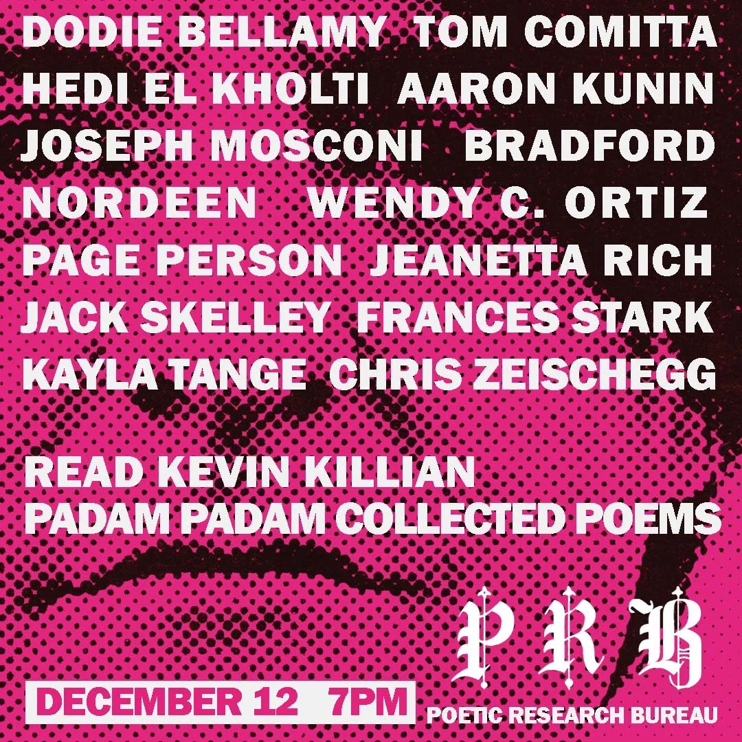 The Poetic Research Bureau presents the launch of Padam Padam: Collected Poems of Kevin Killian, edited by Evan Kennedy and Jason Morris. Featuring readings by Dodie Bellamy, Tom Comitta, Hedi El Kholti, Aaron Kunin, Joseph Mosconi, Bradford Nordeen, Wendy C. Ortiz, Page Person, Jeanetta Rich, Jack Skelley, Frances Stark, Kayla Tange and Chris Zeischegg.