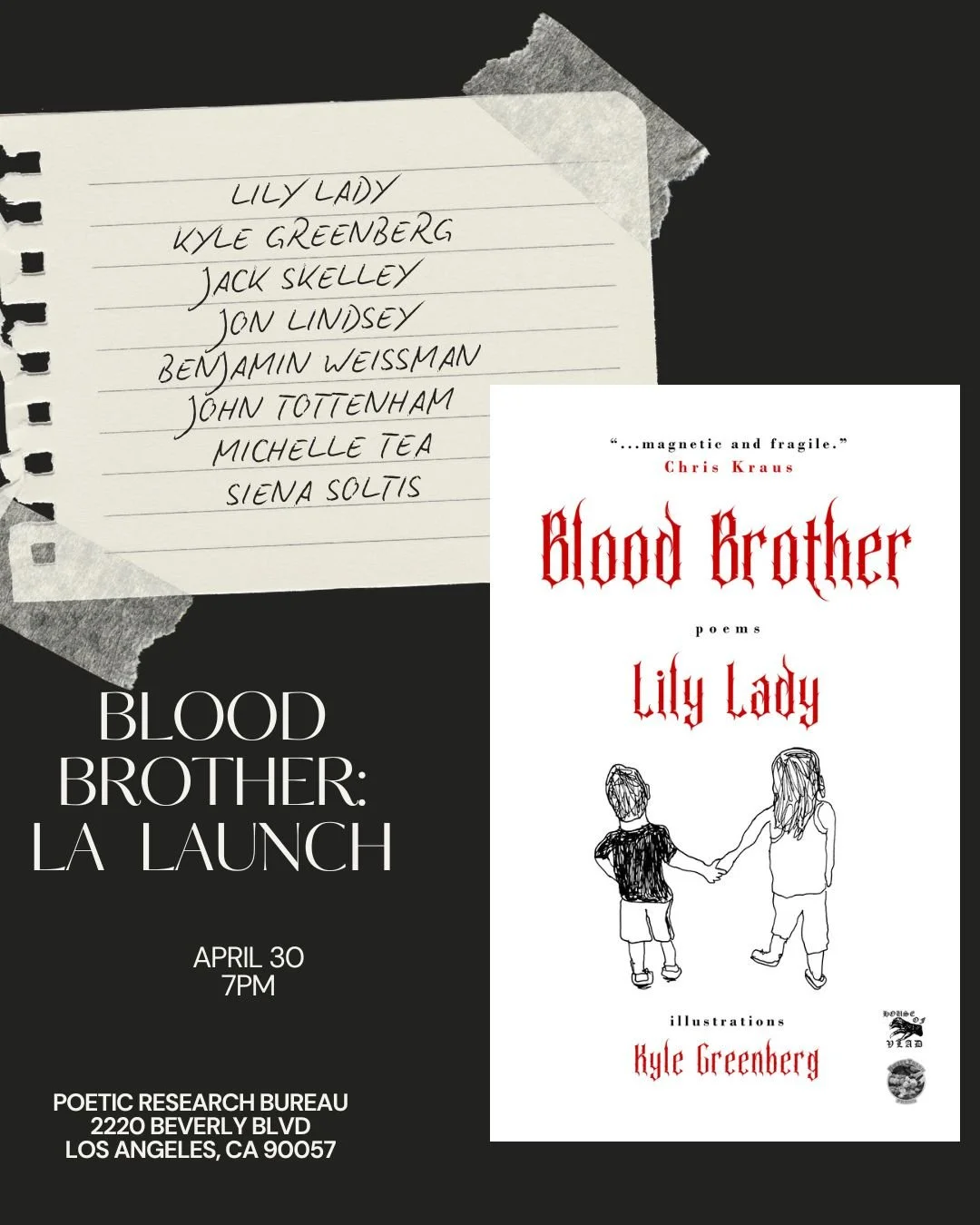 The Poetic Research Bureau presents the Los Angeles launch of Blood Brother by Lily Lady, published by House of Vlad Press. With Kyle Greenberg, Jack Skelley, Jon Lindsey, Benjamin Weissman, John Tottenham, Michelle Tea, and Siena Soltis.