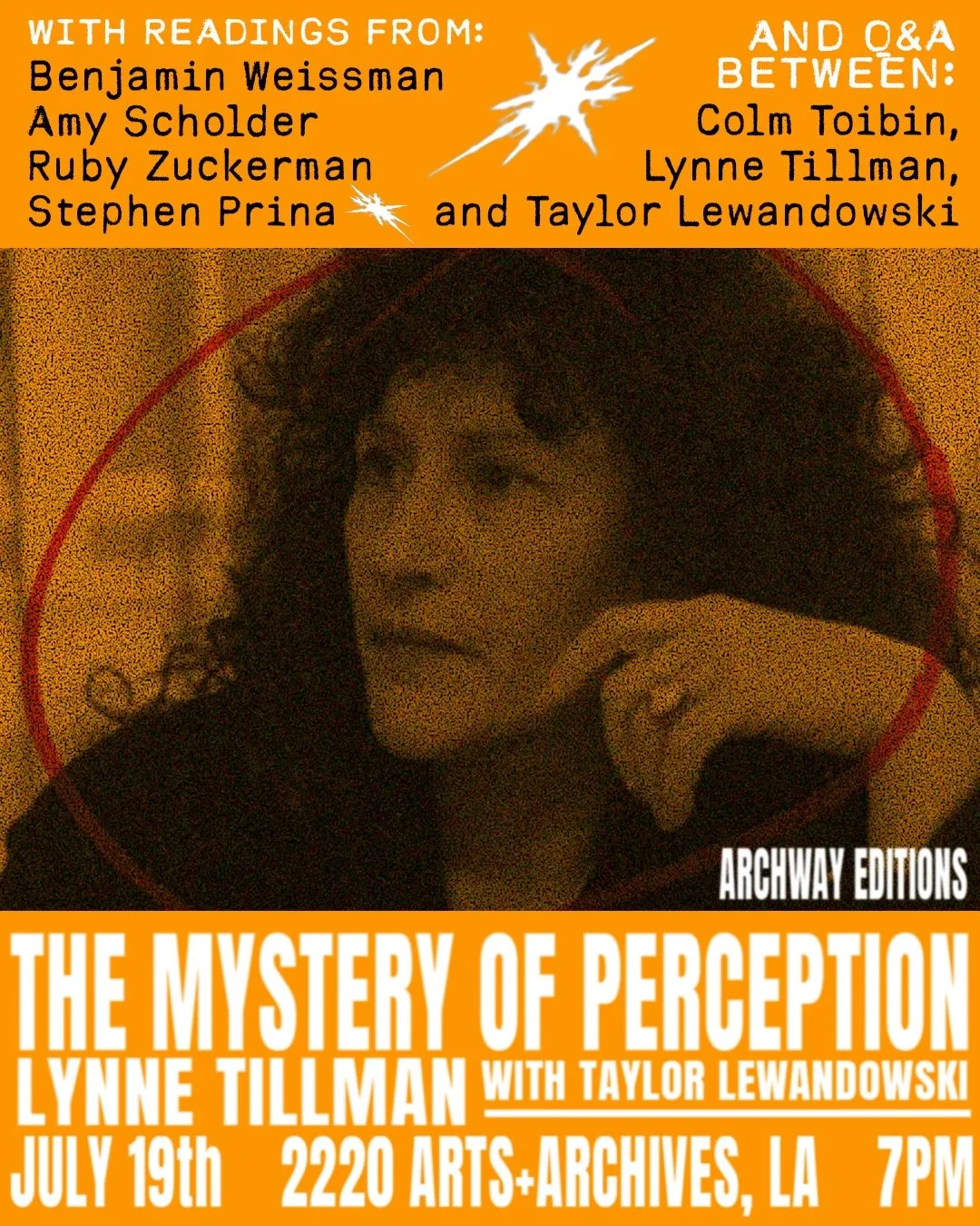 Archway Editions, Semiotext(e) and the Poetic Research Bureau host the LA launch for Lynne Tillman and Taylor Lewandowski’s THE MYSTERY OF PERCEPTION with readings from Amy Scholder, Benjamin Weissman, Stephen Prina, and Ruby Zuckerman followed by a Q&A between Lynne, Taylor, and Colm Tóibín.