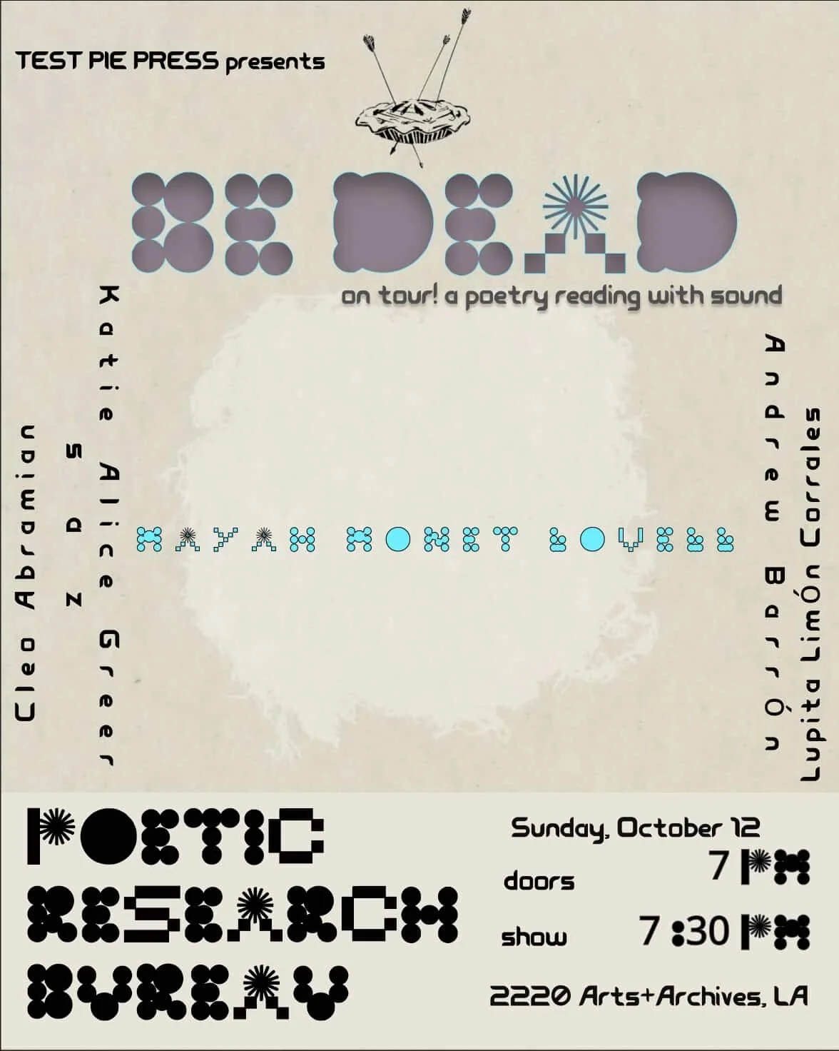 Join The Poetic Research Bureau and Test Tie Press for for an evening of poetry and sound, celebrating the chapbook release of Mayah Monet Lovell’s “Be Dead.”